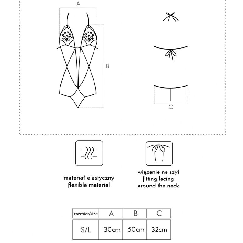 The stretchy material 90% polyamide and 10% elastane makes the bodysuit pleasant to the touch and comfortable to wear. The adjustable drawstring at the neck and back makes it easy to adjust the bodysuit, so it is available in universal size S/L.